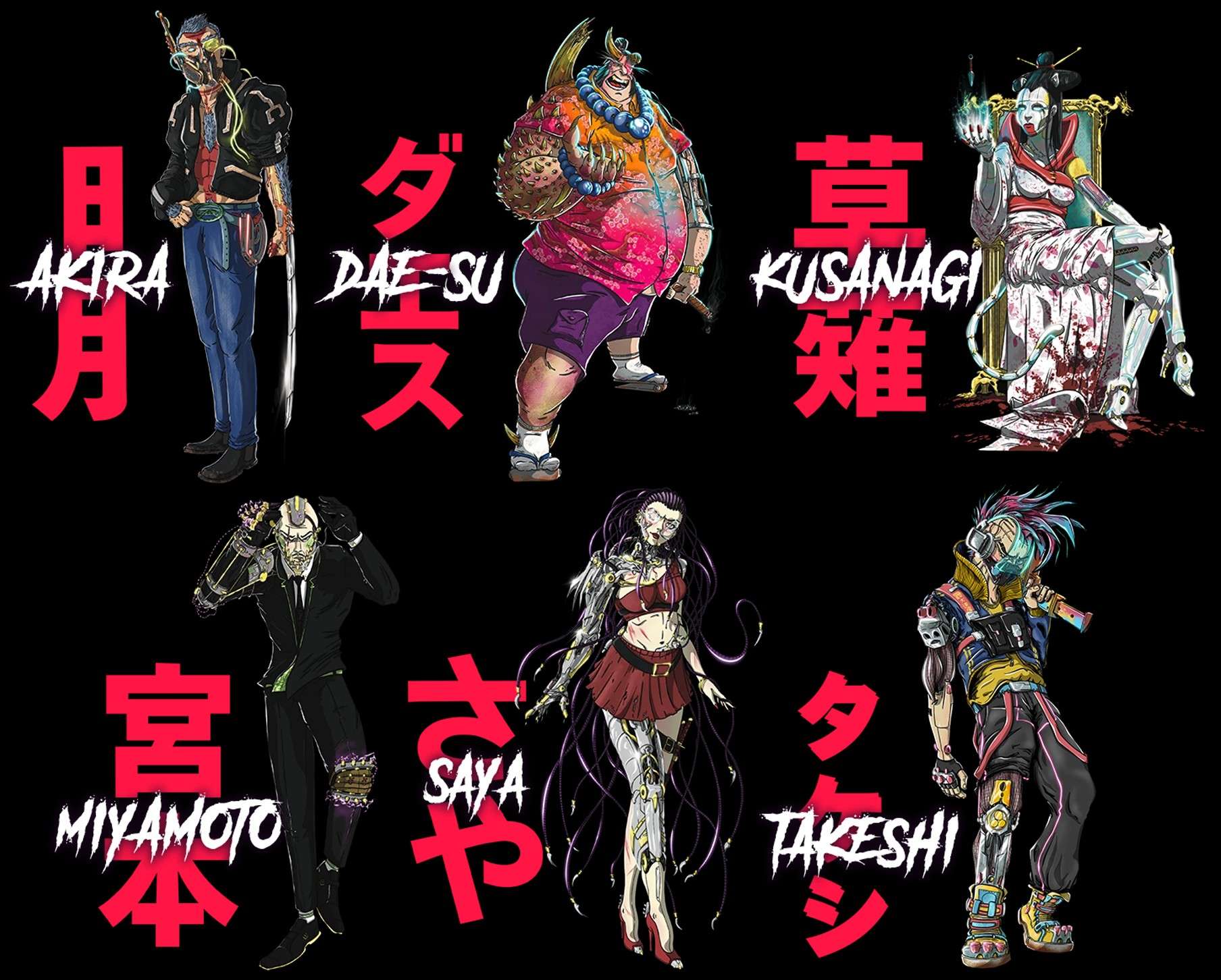 There are currently 6 characters: Saya, Kusanagi, Takeshi, Akira, Dae-Su and Myiamoto. The **OYABUN** team is already working on new characters to add to the **OYABUN** story.